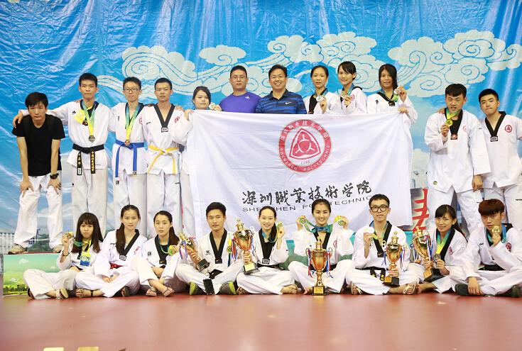 我校跆拳道队在强手如林的对抗中不畏强敌、顽强拼搏,勇夺职业院校丙组七金七银八铜。男、女队均获得中国大学生跆拳道锦标赛丙组团体总分第一名,也是本届大会成绩最好的运动队。为备战本次比赛,在学校领导和体育部领导对跆拳道项目的关心和支持下,校跆拳道队共有19名队员在体育部饶英教练的带领下进行了为期两个月的集训,多次与深圳体校专业队进行联合训练。正是因为有了教练和队员们的团结一心、吃苦耐劳,我校跆拳道队才取得本次赛事的优异成绩。